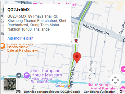 89 Phaya Thai Rd, Khwaeng Thanon Phetchaburi, Khet Ratchathewi, Krung Thep Maha Nakhon 10400, Thaïlande Veuillez activer JavaScript dans votre navigateur pour remplir ce formulaire.Veuillez activer JavaScript dans votre navigateur pour remplir ce formulaire.Nom *PrénomNom ou Commentaire Nom E-mail *Commentaire ou messageEnvoyer